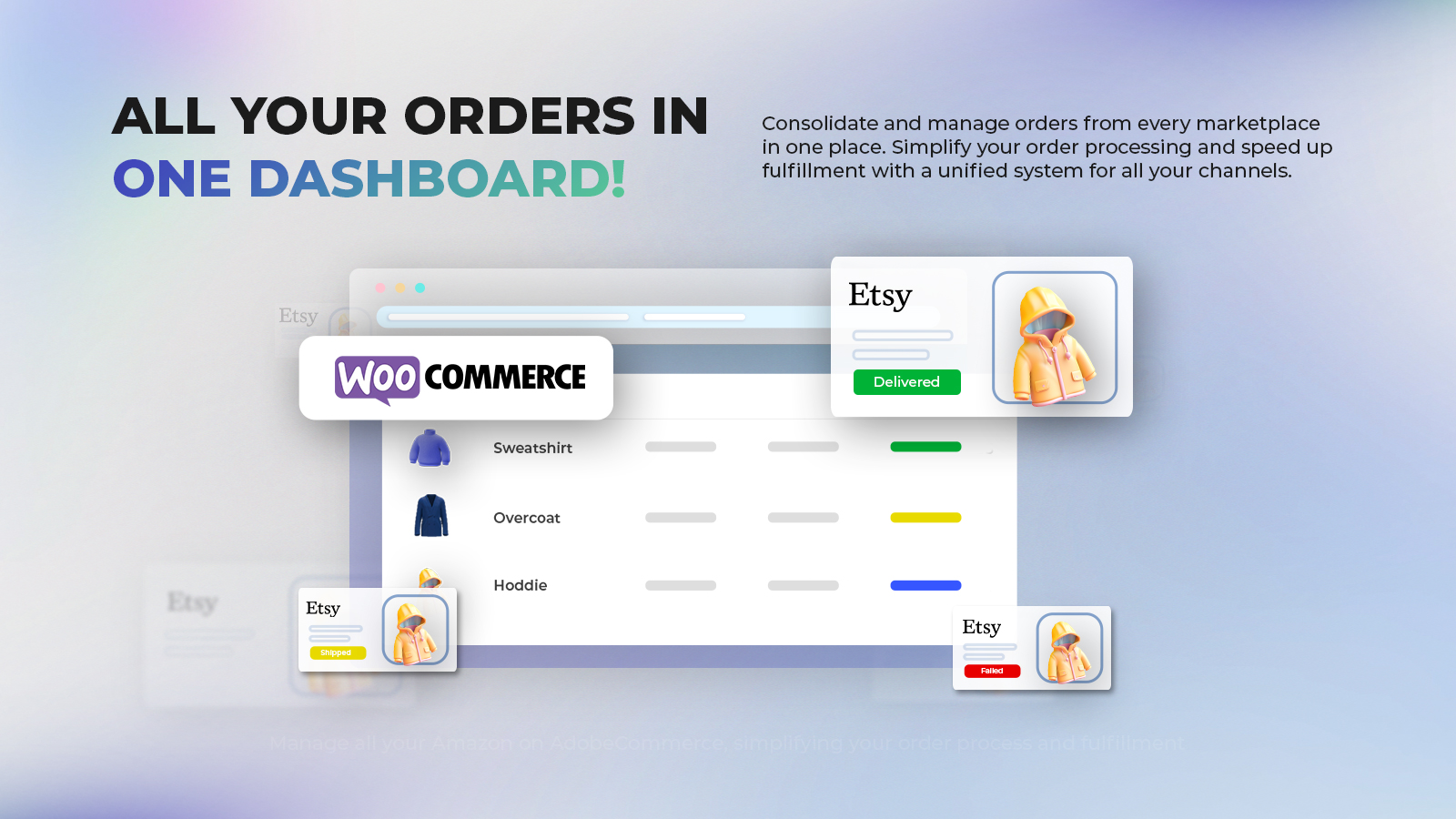 Take the hassle out of managing your Etsy store and let your creative products take center stage. The WooCommerce Etsy Integration gives you full control and flexibility over your sales operations, so you can focus on what you do best—creating. With the WooCommerce Etsy integration, you can list products and sync inventories in real time. Additionally, you can manage orders from a single platform.